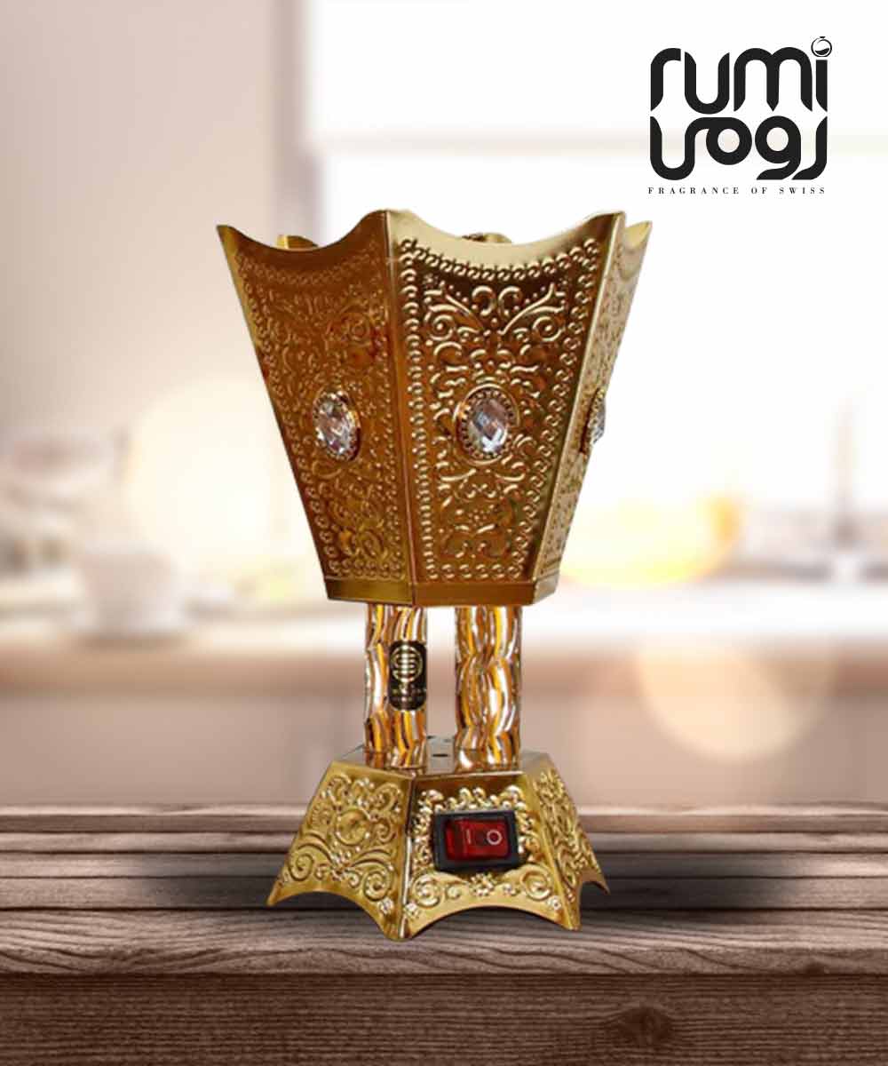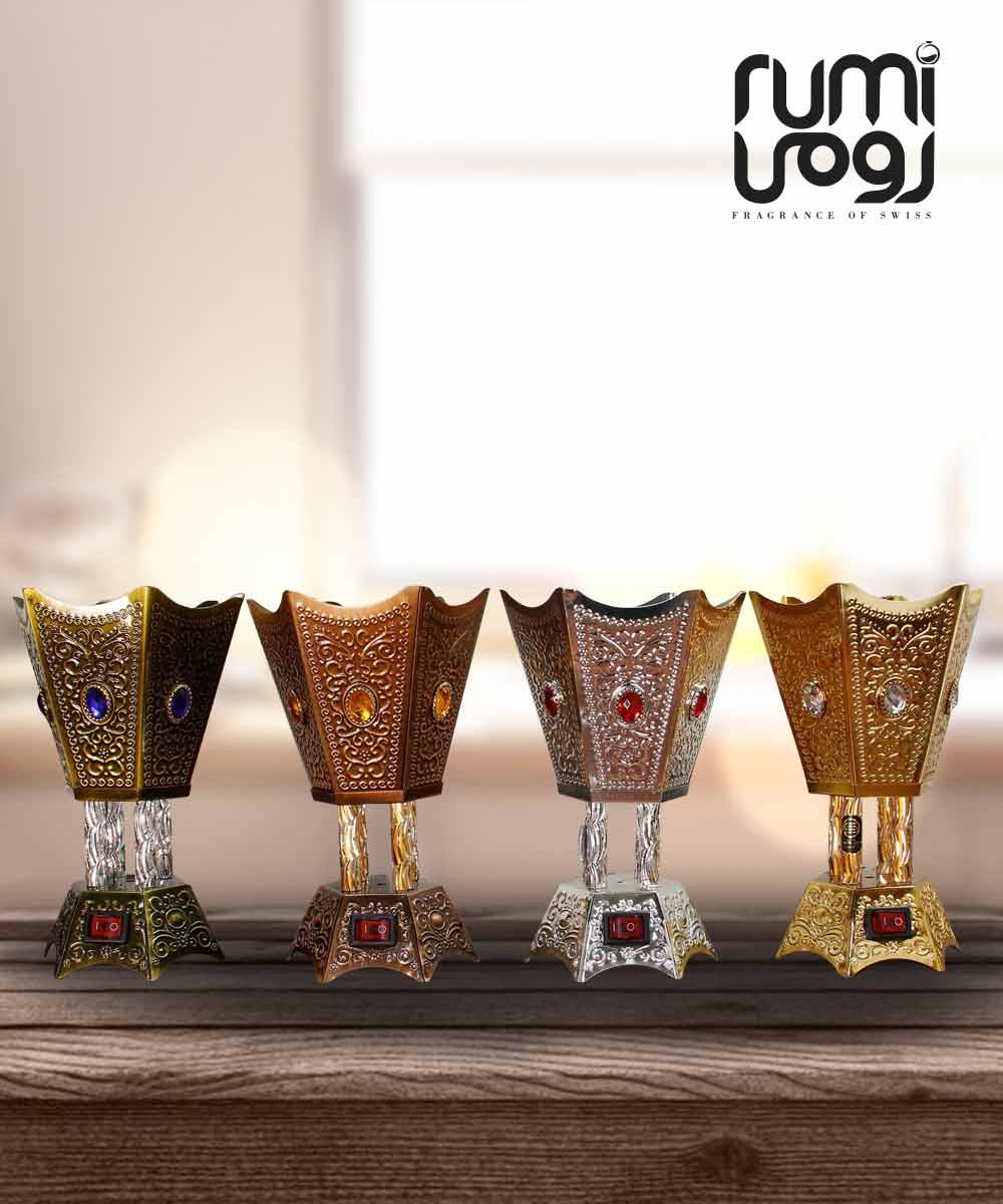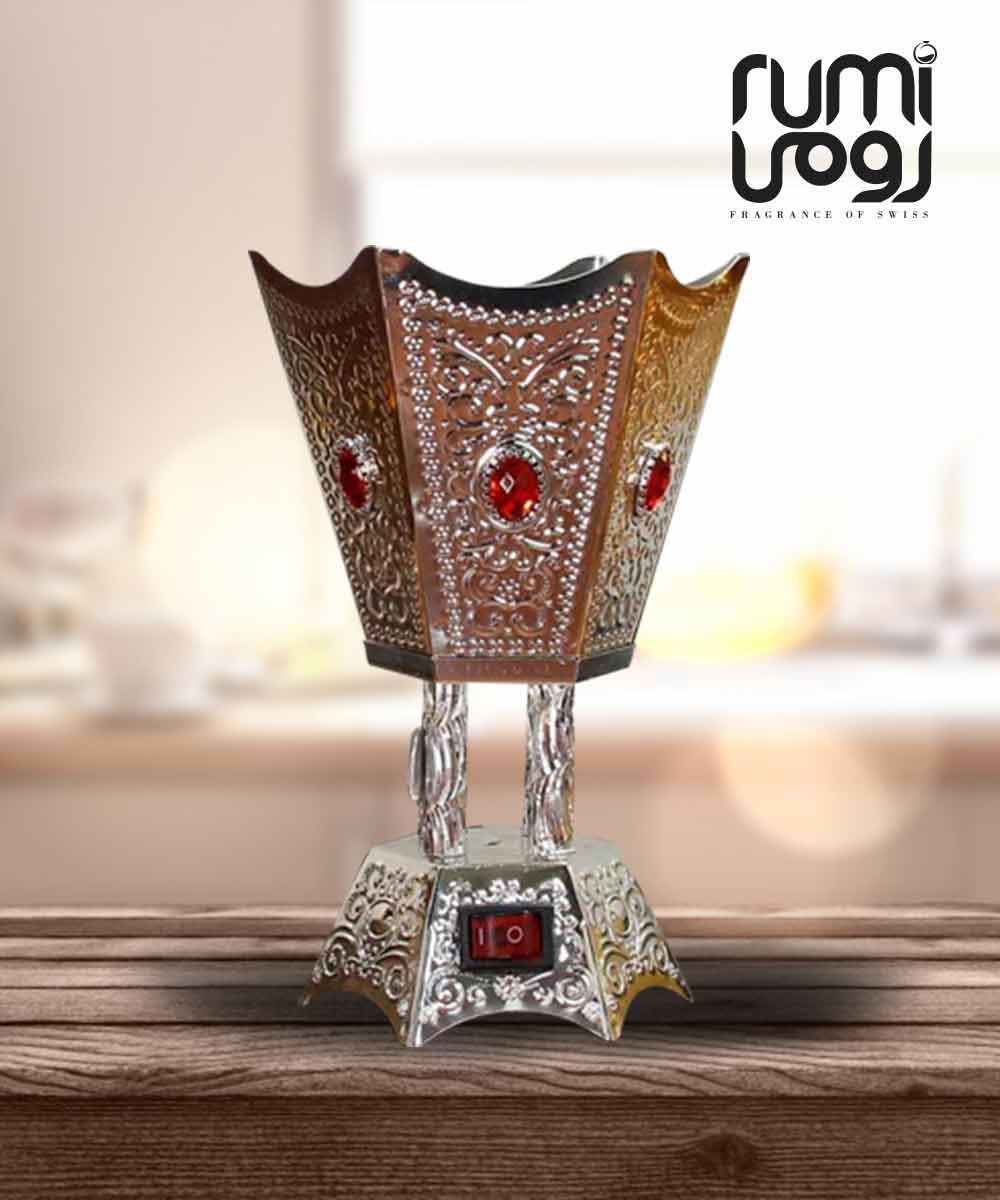 DESIGN: Six-sided, beautifully crafted metallic burner with intricate detailing and a shining jewel on each side. Great for decoration purposes too.